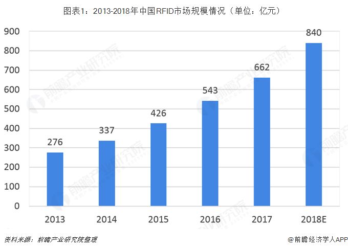 根据中国RFID产业联盟,自2010年中国物联网发展被正式列入国家发展战略后,中国RFID及物联网产业迎来了难得的发展机遇。2011-2017年,中国RFID行业的市场规模呈不断上涨趋势,且增速保持较快。2017年,中国RFID行业市场规模为662亿元。前瞻预计2018年我国RFID行业市场规模将达到840亿。