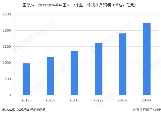 新医改背景促使医疗与药品智能追溯系统进入快速发展期;国家加大对食品卫生行业物流过程的监控力度,使食品智能追溯系统也进入快速发展时期。因此,在医疗行业改革和国家加大对食品安全管理的趋势下,RFID应用前景广阔。前瞻预计,我国RFID行业市场规模年均复合增长率维持在15%左右,到2024年将突破2000亿元。