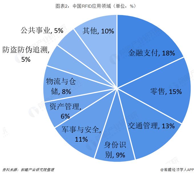 从我国RFID在各个领域的应用市场占比情况,可以看出,目前金融支付是其目前应用最大的市场,占到18%;其次是零售和交通管理,分别为15%和13%。